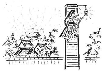 私は農村で火の見やぐらを見つけると、必ず八百屋お七が半鐘を打っている江戸絵を思い出す。先にも述べたような木のはしごの火の見やぐらにうら若い女が髪を振り乱し、赤い湯文字をあらわに反狂乱の形相で半鐘を乱打している。そしてやぐらの前面には紅蓮の炎がうず巻いて、お七を今にも炎が包んでしまいそうな悽惨(せいさん)な場面を描いた図柄だ。